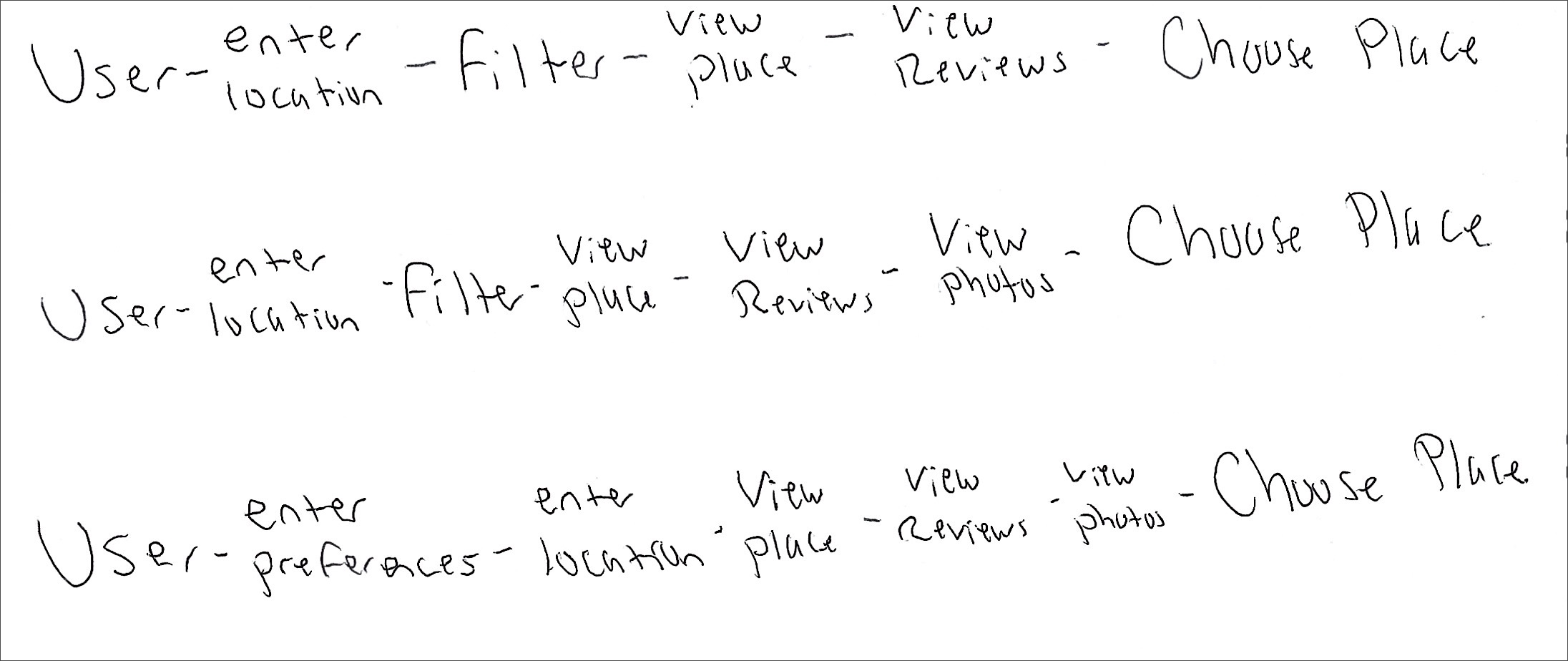 After creating my map and initial sketches, it was time to combine them into the storyboard. The main flow of the app was the user entering their location, finding a place, and learning more about the place. I wanted to include four main parts of the place’s profile: