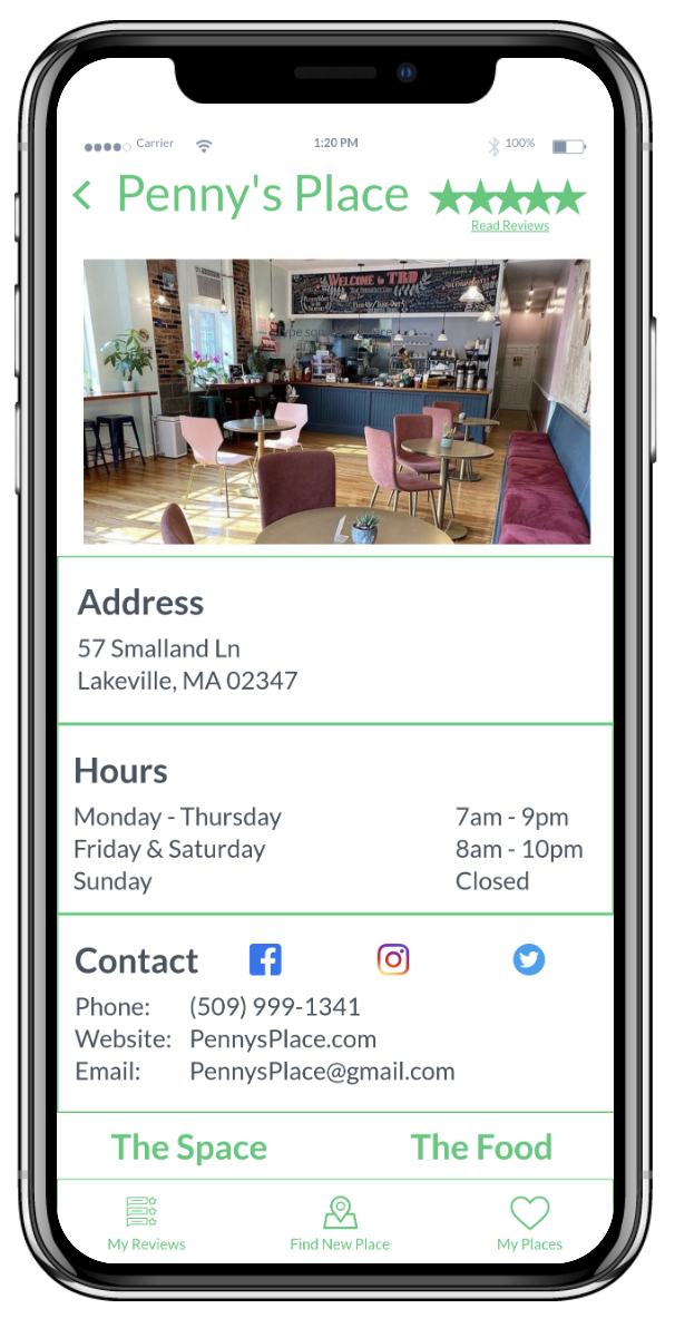 After the user testing, I made some changes to the PostUp app. I created links to the review section under the star rating of the place's profile. I also created direct links to The Food, The Space, and back to the main profile. This way, users would not need to click through every detail screen to get to the information they needed. I also edited the bottom navigation and top status bar so they wouldn’t get cut off.