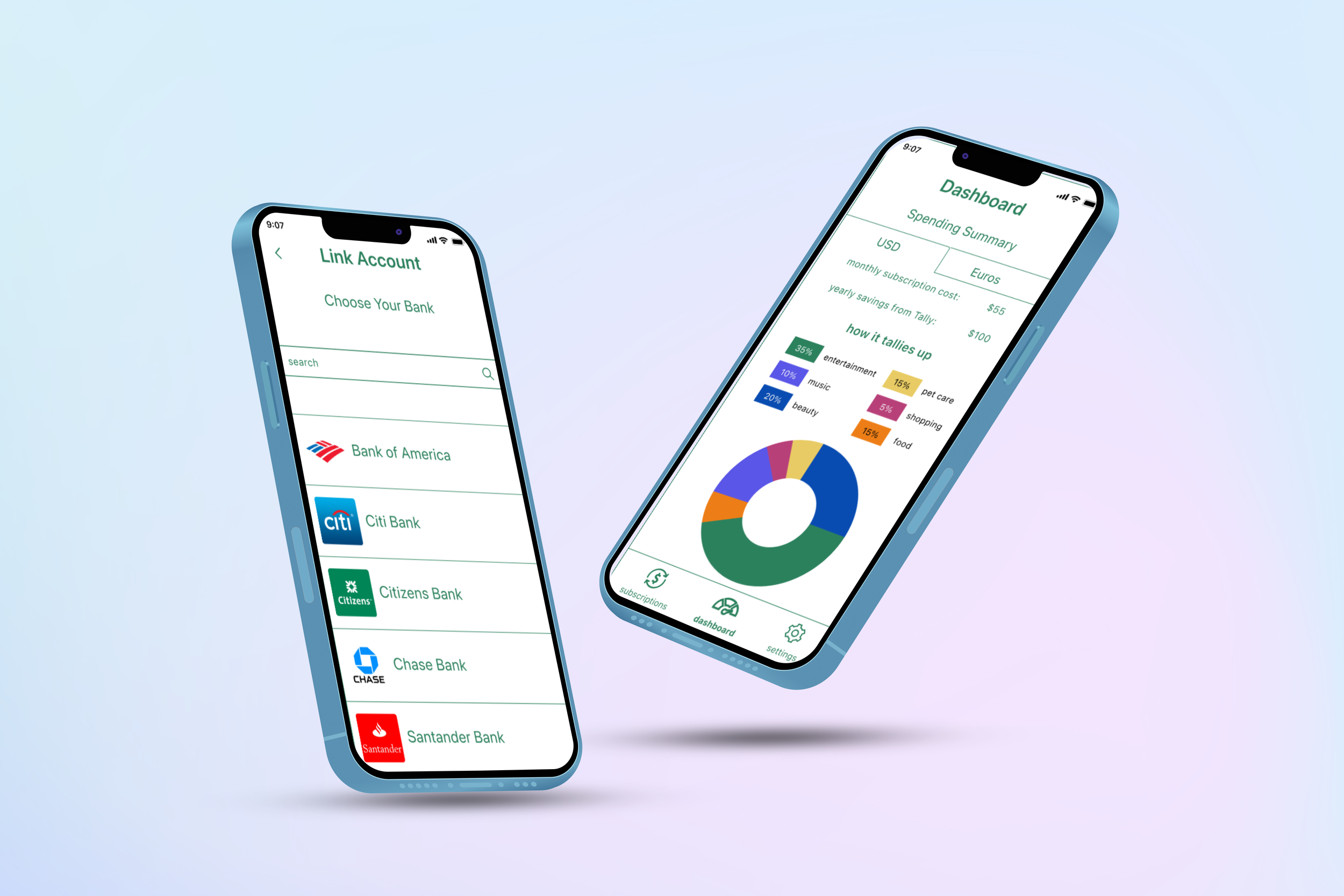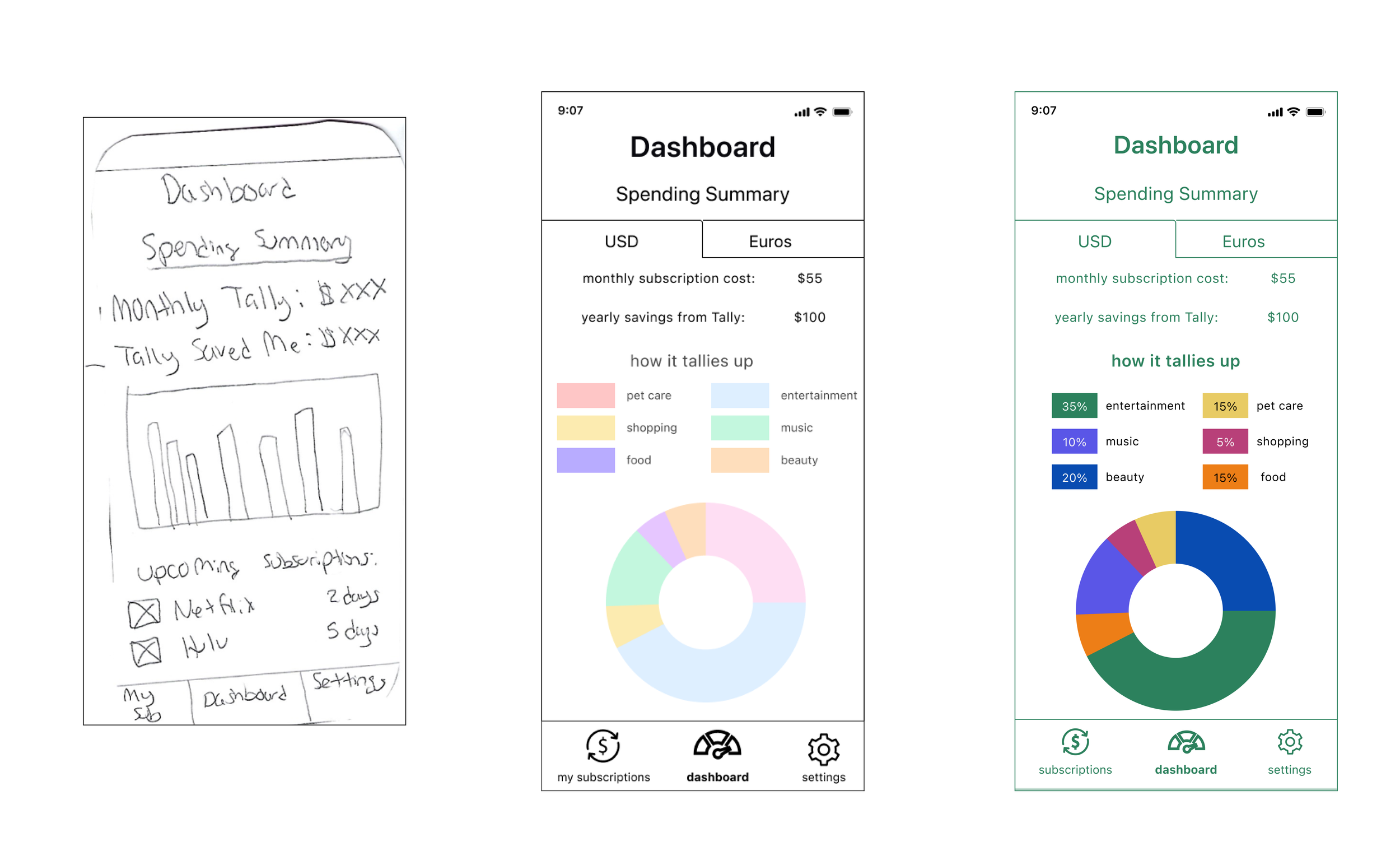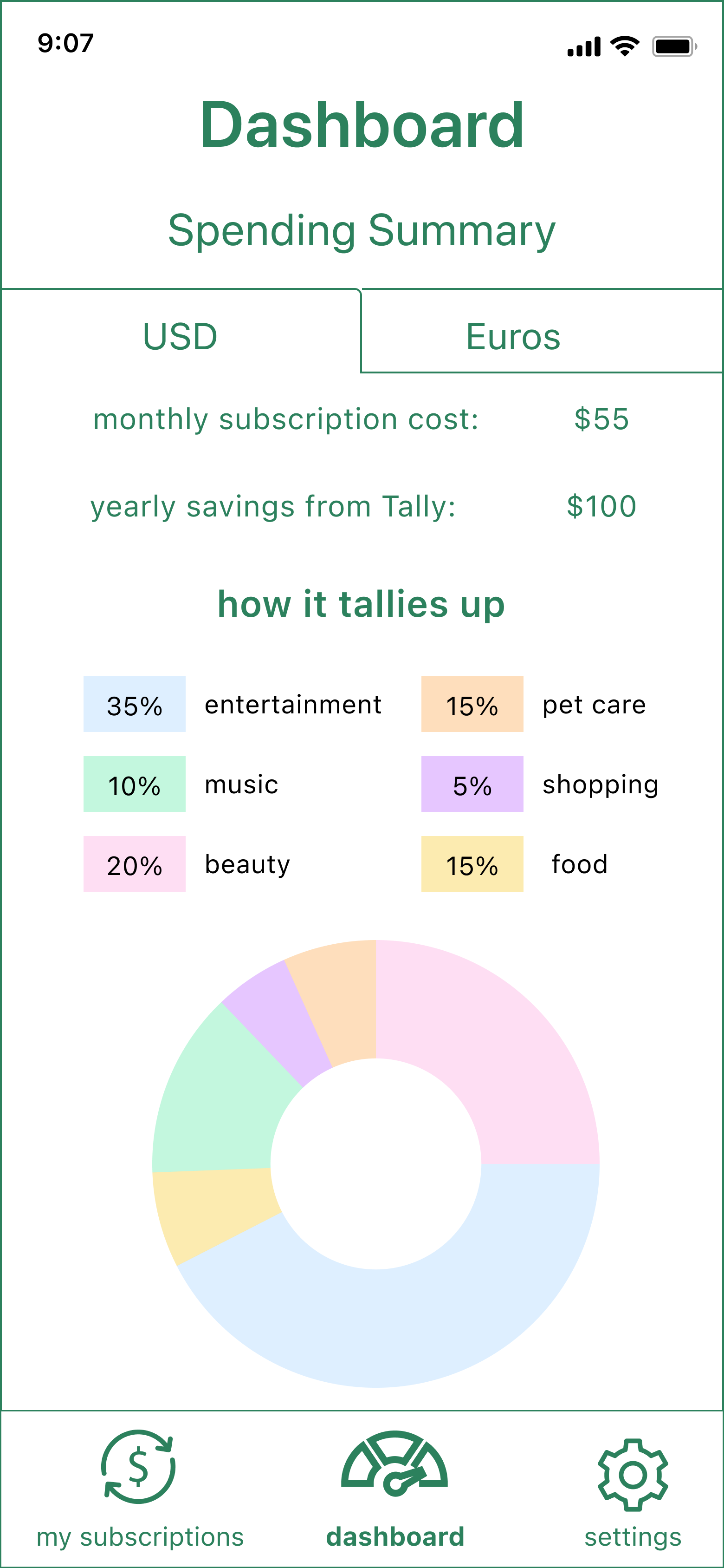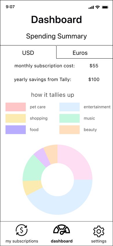 I thought about my target users and their needs and created three main red routes: My Subscriptions, Dashboard, and Settings. Users could view, add, edit, and cancel their subscriptions in My Subscriptions. The Dashboard shows users how much Tally has saved them in both USD and Euros. Since Tally is expanding to the German market and some people pay for subscriptions in both Euros and USD, I wanted to create a comprehensive experience where users can use both currencies. Another feature on the Dashboard is a visual showing the breakdown of the kinds of subscriptions the users pay for. In Settings, the user can add or remove their bank information, change their login information, and log out of Tally.