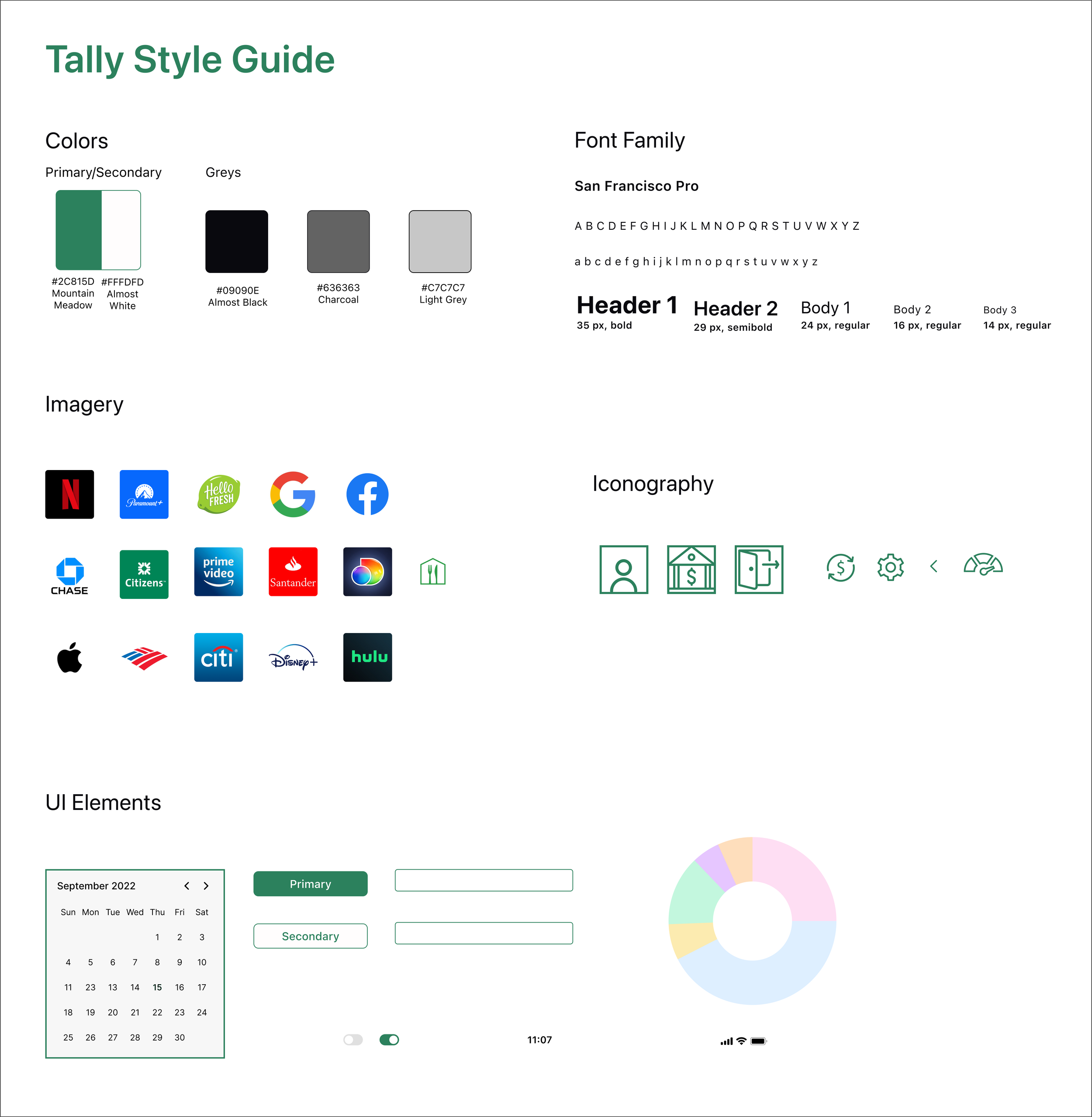 As part of the high fidelity design, I wanted to show Tally’s brand in all aspects. I used the dark green company color for most of the text and icons. I used mostly lowercase text in order to create a more friendly and casual vibe.