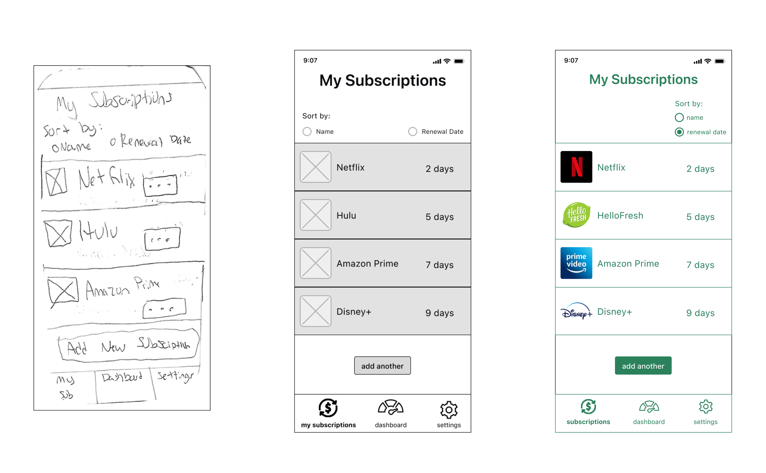 I did make some changes to my design. On the initial sketch for the Dashboard, I included information about the user’s upcoming subscriptions. When creating my mockup, I removed that information. Instead, I added when the subscription’s next renewal is under My Subscriptions, This made the Dashboard less crowded and more visually appealing by adding additional white space.